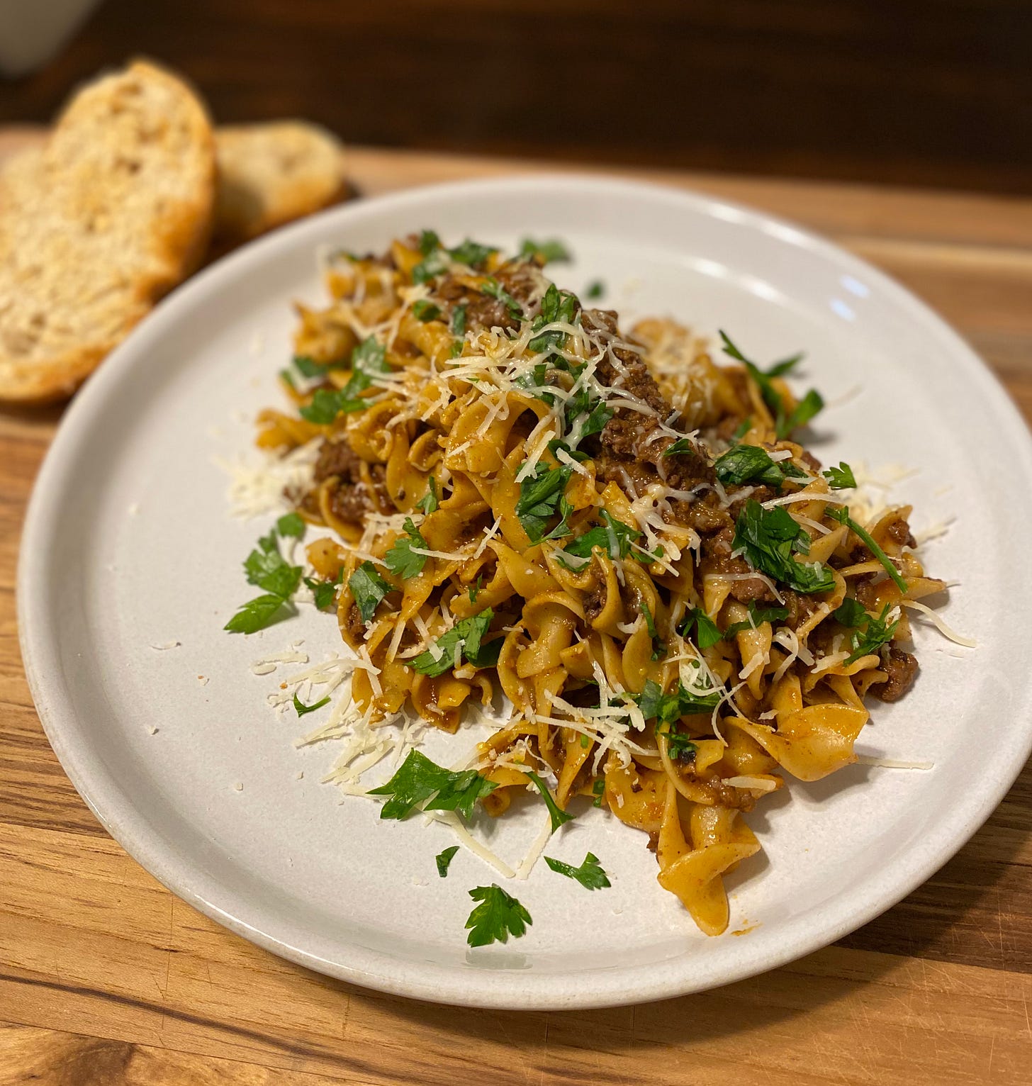 Add a healthy glug of milk at the end to bring the sauce together. Boil some pasta just under al-dente, and finish cooking it in bolognese+pasta water (I scavenged some “wide egg-noodles” from Ralphs here). I finished with some fresh Italian parsley and grated parmesan on top. And that’s it!